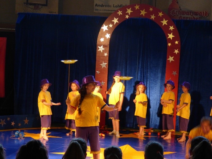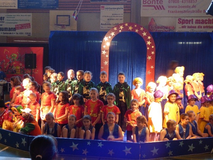 Die zwanzig Stunden der Projektwoche vergingen wie im Fluge und schon stand am Donnerstag um 18 Uhr die große Zirkusaufführung auf dem Programm. Das Lampenfieber der Kinder, und auch der Betreuer, war groß, aber alles klappte wie am Schnürchen.