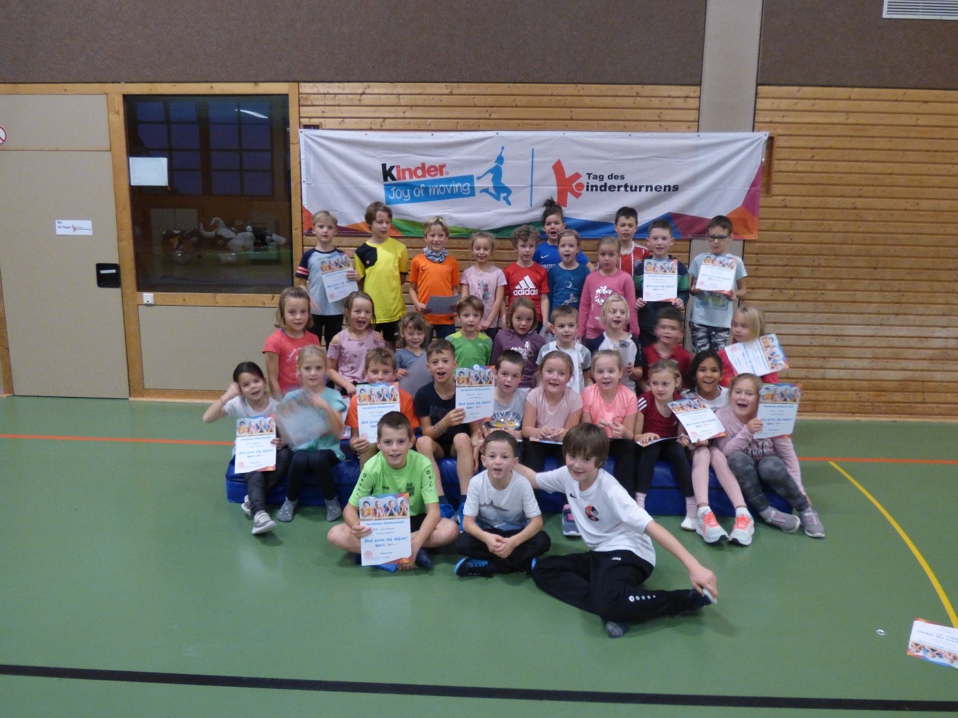 Am Samstag, den 13. November beteiligte sich der Turnverein Zunsweier am bundesweiten Tag des Kinderturnens. Zu diesem besonderen Tag lud der Deutsche Turner-Bund in Kooperation mit der Bewegungsinitiative „kinder Joy of Moving“ alle Kinder ein, in die Welt des Kinderturnens reinzuschnuppern. Hunderte Vereine öffneten an diesem Tag ihre Türen, um Kindern einen bewegt-bewegenden Tag zu bescheren. In Zunsweier bewegten sich in zwei Gruppen von 14 Uhr bis 17 Uhr über siebzig Kinder in unserer Turnhalle. Eigens für diesen Tag hat die Deutsche Turnerjugend das „Das kann ich schon!" Abzeichen entwickelt. Im Rahmen des Aktionstages konnten die Kinder an verschiedenen Stationen ausgewählte Übungen absolvieren und erhielten als Belohnung eine Urkunde und ein Abzeichen. Die Übungen mit Handgeräten, wie Seil oder Ball, aber auch an beliebten größeren Geräten, wie Bank oder Trampolin wurden von den Kindern mit Feuereifer absolviert. An jeder Station gab es einen heißersehnten Stempel auf der bunten Laufkarte. Die Übungen vermittelten den Kindern Vertrauen in ihren Körper und zeigten ihnen, was sie schon alles können.